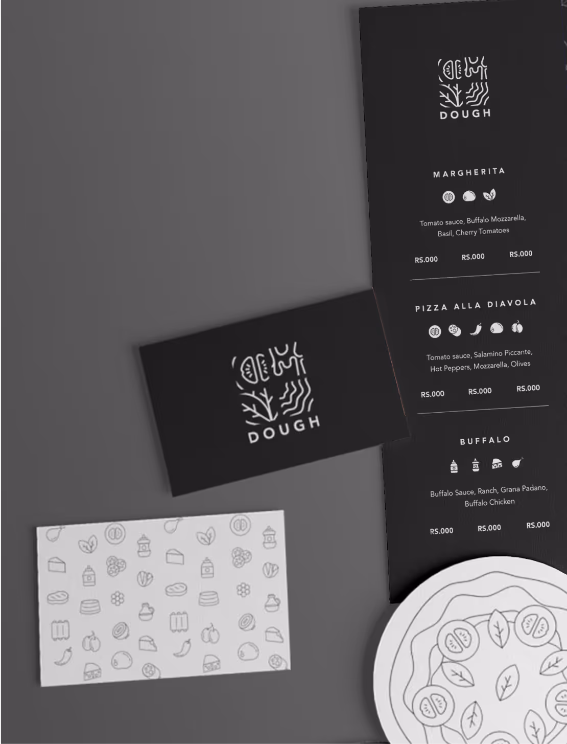 My role as the visual designer spanned brand, social, and web. I led sessions with the client to define brand values and personality, explored how the identity would extend into the physical space and interiors, and planned the photography and social strategy to ensure consistency across every touchpoint. The result was a cohesive identity that elevated Dough beyond the typical pizzeria and built a memorable food brand experience that felt both exclusive and contemporary.