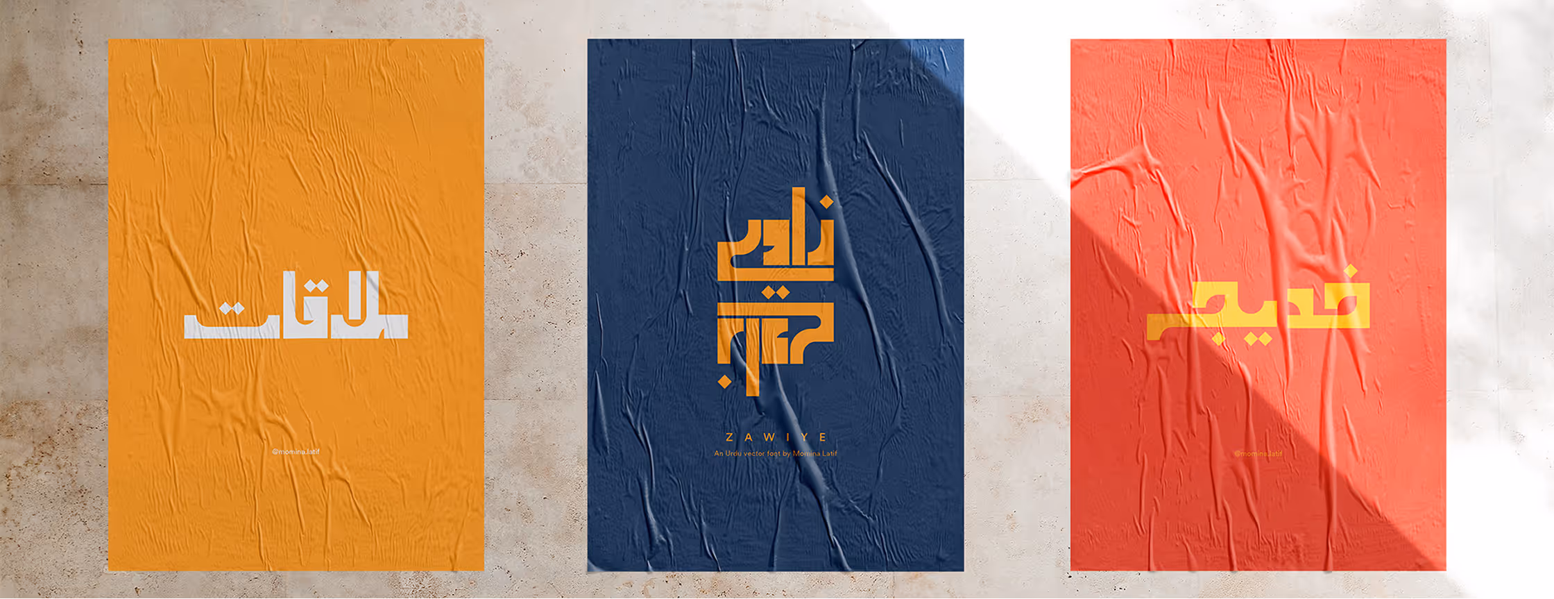 Zawiye is the first complete Urdu typeface from my self-initiated venture to digitalize and beautify the Urdu language. The name, which translates to “angles” in Urdu, reflects the font’s defining character—it breaks away from the traditional calligraphic, free-flowing script and instead embraces a structured, geometric style reminiscent of Kufic script.
